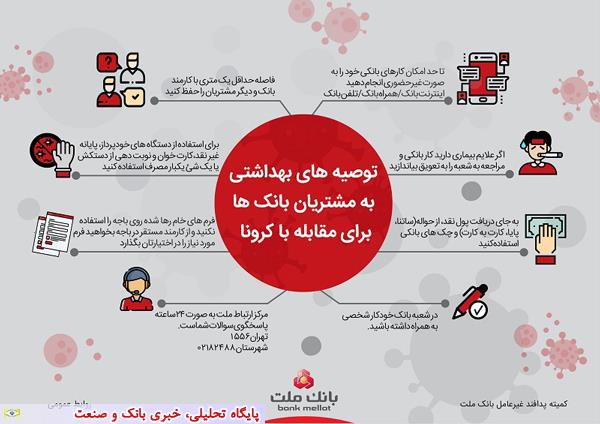 بانک ملت در عین حال با ارائه توصیه های بهداشتی به مشتریان برای مقابله با ویروس کرونا، از آنان خواست اگر علائم این بیماری را در خود مشاهده می کنند انجام امور بانکی و مراجعه به شعب را به تعویق بیندازند.