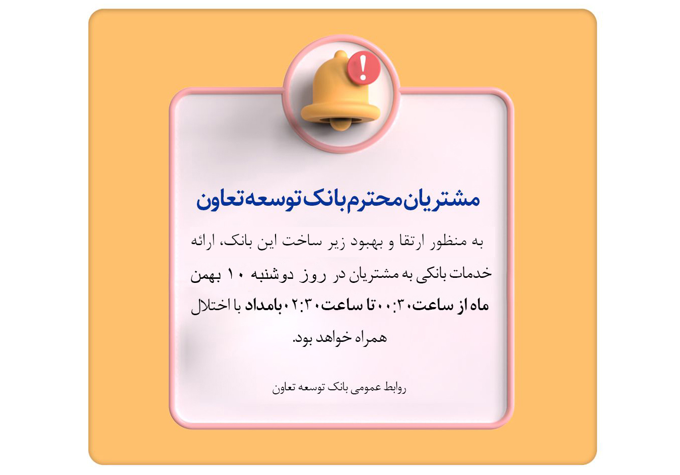 اختلال موقت در کلیه سامانه های بانک توسعه تعاون.