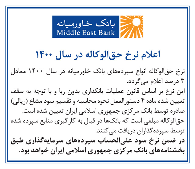 در ضمن نرخ سود علی الحساب سپرده های سرمایه گذاری طبق بخشنامه های بانک مرکزی جمهوری اسلامی ایران خواهد بود.