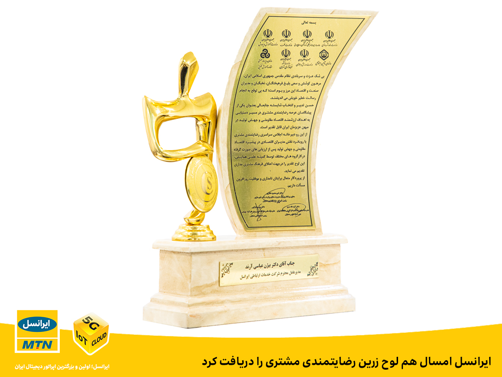 با اهدای این لوح تندیس، از ایرانسل، اپراتور پیشرو در کسب رضایت مشتری و نخستین ارائه دهنده 5G در ایران، به عنوان «یکی از پیشگامان عرصه رضایتمندی مشتری در مسیر دستیابی به اهداف ارزشمند اقتصاد مقاومتی و جهش تولید» تقدیر شده است.