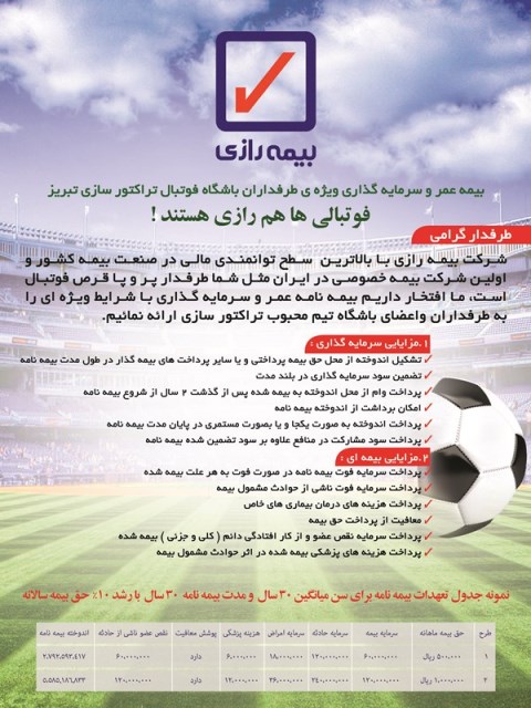 به گزارش پایگاه تحلیلی خبری بانک و صنعت به نقل از روابط عمومی بیمه رازی، طرح بیمه عمر و سرمایه گذاری ویژه طرفداران باشگاه فوتبال تراکتور سازی تبریز به تازگی از سوی این شرکت آماده اجرا می باشد.