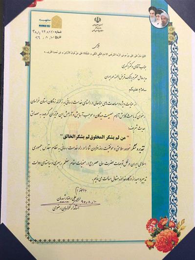 تقدیر و تشکر نموده، سلامتی و موفقیت روزافزون شما را در راه خدمت رسانی به نظام مقدس جمهوری اسلامی ایران در ظل توجهات حضرت ولی عصر(عج)، منویات مقام معظم رهبری و سیاست های دولت تدبیرو امید از درگاه خداوند متعال مسالت می نمایم.