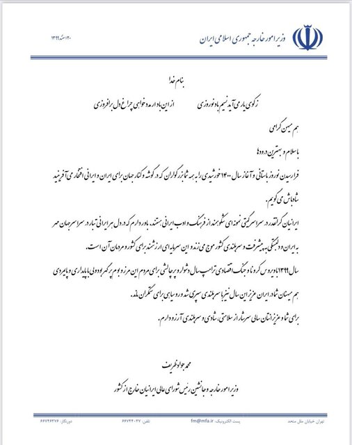 محمدجواد ظریف به عنوان وزیر امور خارجه و جانشین رییس شورای عالی ایرانیان خارج از کشور با ارسال پیامی به تعدادی از ایرانیان خارج از کشور فرا رسیدن سال نو را به آنها تبریک گفت.