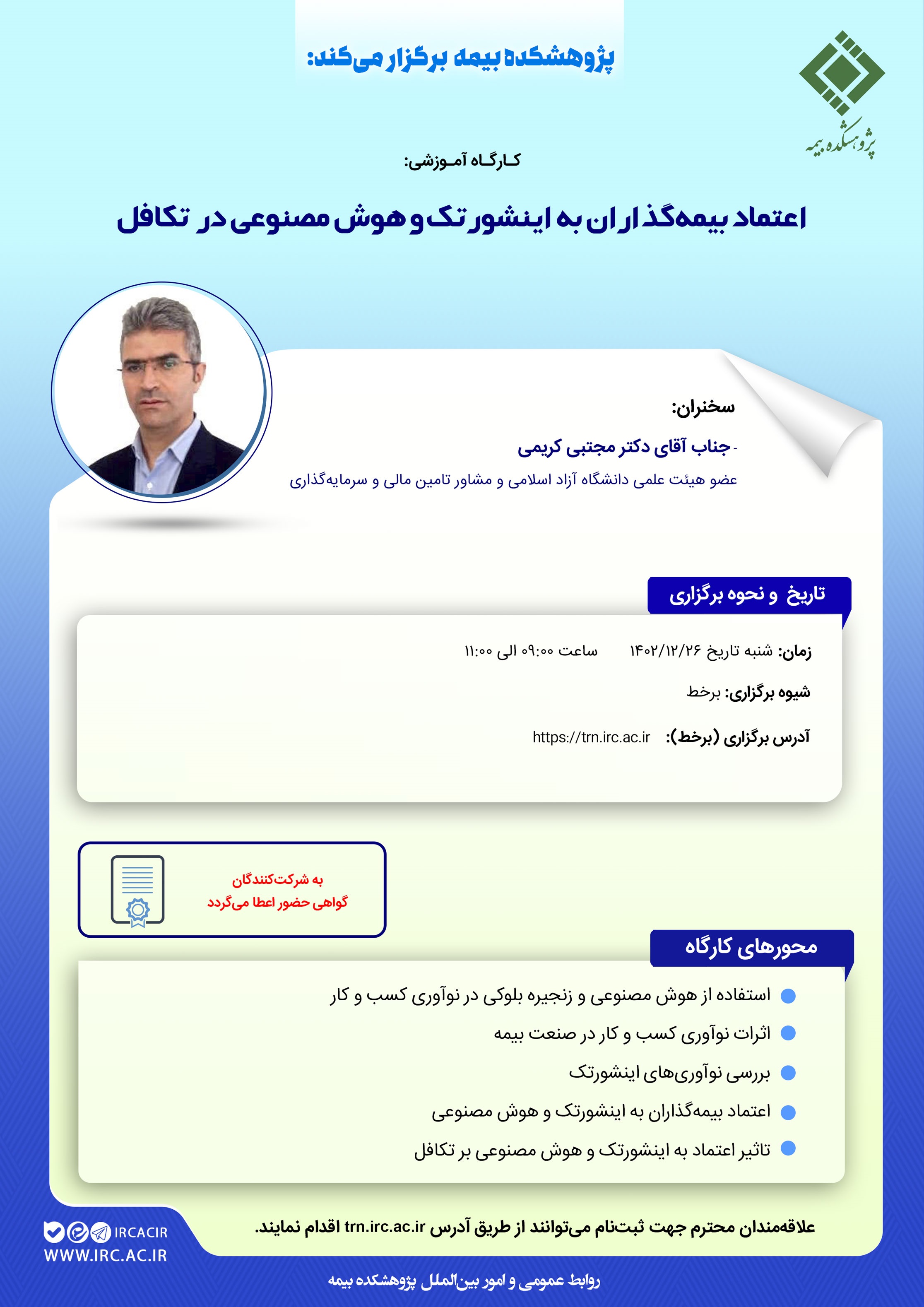 حضور در این رویداد علمی برای عموم آزاد و مستلزم ثبت نام از طریق سامانه مدیریت یادگیری پژوهشکده بیمه به نشانی https://trn.irc.ac.ir میباشد.