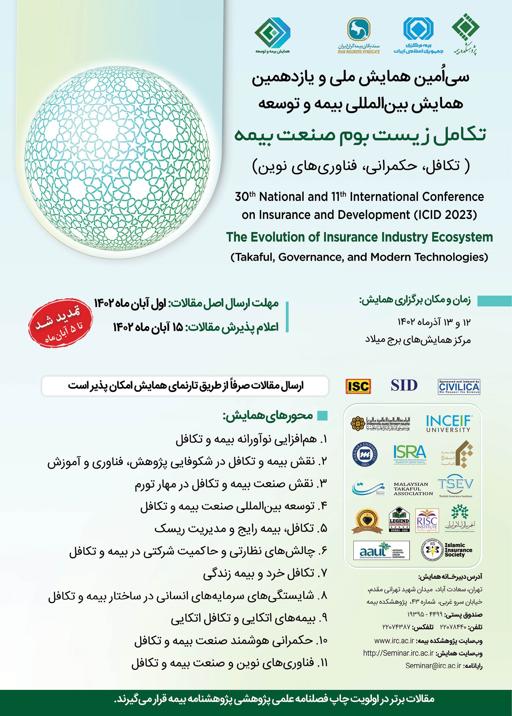 علاقه مندان به مشارکت علمی در این همایش تا پایان روز جمعه 5 آبان سال جاری فرصت دارند تا مقالات خود را پیرامون محورهای «هم افزایی نوآورانه بیمه و تکافل»، «نقش بیمه و تکافل در شکوفایی پژوهش، فناوری و آموزش»، «نقش صنعت بیمه و تکافل در مهار تورم»، «توسعه بین المللی صنعت بیمه»، «تکافل، بیمه رایج و مدیریت ریسک»، «چالش های نظارتی و حاکمیت شرکتی در بیمه و تکافل»، «تکافل خرد و بیمه زندگی»، «شایستگی های سرمایه های انسانی در ساختار بیمه و تکافل»، «بیمه های اتکایی و تکافل اتکایی»، «حکمرانی هوشمند صنعت بیمه و تکافل» و «فناوری های نوین و صنعت بیمه و تکافل»، به دبیرخانه همایش ارسال نمایند.
