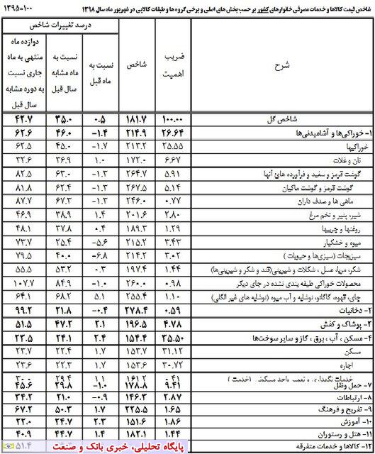 بررسی تغییر قیمت در بخشهای مختلف مصرفی و مقایسه با شهریور سال گذشته نشان میدهد که هزینه خوراکیها و آشامیدنیها حدود 46 درصد افزایش داشته است. در بین آنها ماهیها و صدفداران با 67.3 درصد بیشتر تورم را داراست و بعد از آن گروه گوشتها با حدود 63 درصد قرار دارد که نسبت به سال گذشته افزایش قیمت داشتهاند.