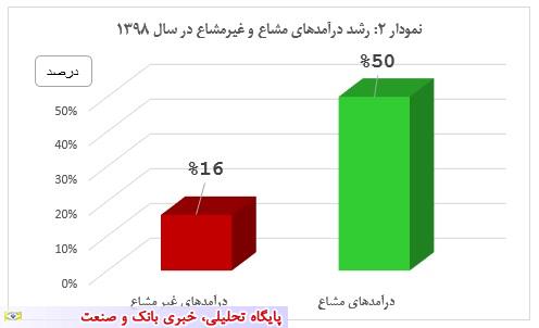 یکی از دلایل تغییر مسیر زیان به سودآوری در سال 1398، حرکت در مسیر افزایش درآمد مشاع و غیرمشاع بوده است. در این سال، درآمدهای بانک به شرح نمودار شماره 2 افزایش یافته است. دلیل کندی رشد در درآمدهای غیرمشاع، حرکت محتاطانه بانک در بخش تعهدات است که با نهادینه کردن برنامه های هدفمند، آموزش حرفه ای و ایجاد مکانیزم های لازم در این عرصه، انتظار این است درآمدهای کارمزدی درسال جاری افزایش قابل توجهی داشته باشد.
