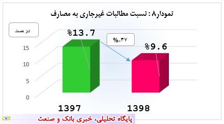 روند نسبت مطالبات به تسهیلات پست بانک ایران روند نزولی داشته و با برنامه ریزی و پیگیری های انجام شده، این نسبت طی یک سال گذشته 37% کاهش داشته و پایین تر از نسبت شبکه بانکی قرار گرفته است که در نمودار شماره 8 آورده شده است.