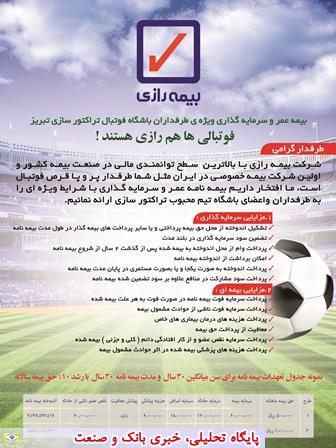 به گزارش پایگاه تحلیلی خبری بانک و صنعت به نقل از روابط عمومی بیمه رازی، طرح بیمه عمر و سرمایه گذاری ویژه طرفداران باشگاه فوتبال تراکتور سازی تبریز به تازگی از سوی این شرکت آماده اجرا می باشد.