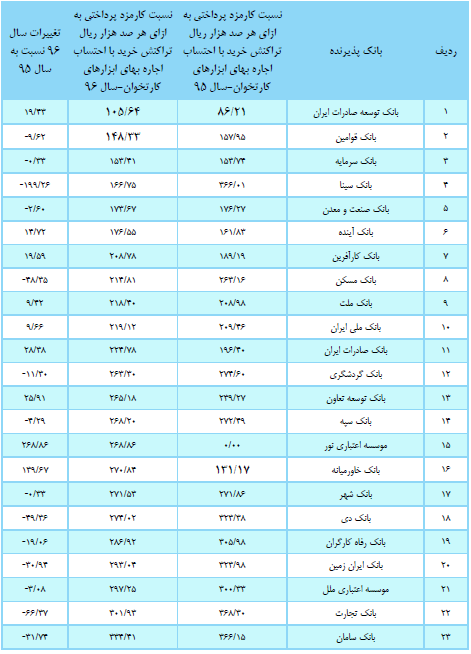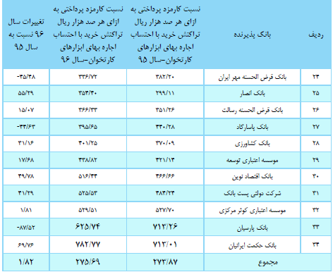 میزان کارمزد پرداختی هر بانک به ازای هر صد هزار ریال در سال 96